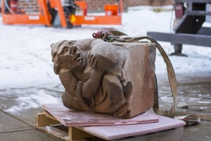 Once all the figures were scanned, masons carefully removed one from its perch as a test, using concrete saws, drills, shims, and a large crane to lift the 500 lb. carving to the ground. The process went as smoothly as could be hoped—boding well for the eventual removal of the remaining 33 figures. Their future use on campus is not yet fully decided, but current architectural renderings suggest a space for them along an outside corridor that will exist between Harrington Auditorium and the new building. Additional ideas are being considered, as well.