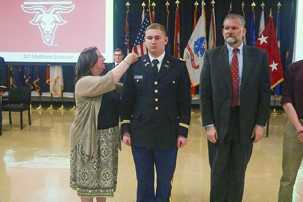 Prior to accepting their commission certificates and exchanging First Salutes, Bienlien had the cadets post on the grass in front of the stage, where friends and family members greeted them and pinned the gold 2nd lieutenant bars on their uniforms. Then as their names were called, the new officers individually crossed the stage, bumping elbows with President Leshin and saluting Bienlien, Heppe, and Skiles before crossing the stage to exchange their ceremonial First Salute.