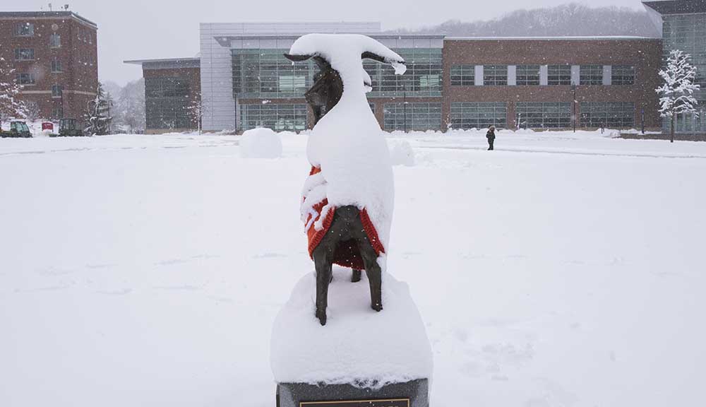 One week later, Gompei––wearing his custom sweater––stands guard over the Quad as winter storm Quinn roars through Worcester, leaving more than a foot of snow and canceled classes in its wake.