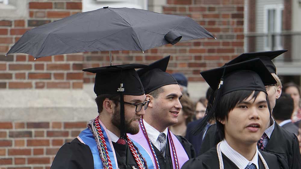 We may have spoken too soon on the whole "spring" thing. Luckily, the less than ideal weather was no problem for our problem-solving students, one of whom took advantage of the day to model the latest in practical and stylish mortarboard fashion at the Undergraduate Commencement.