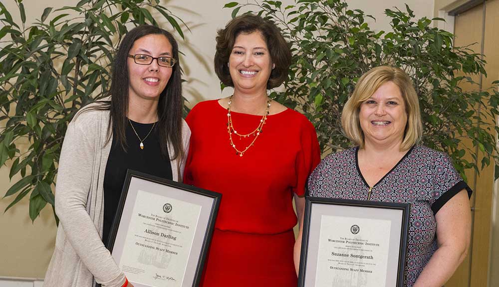 Following her Town Hall meeting on May 4, President Laurie Leshin presented Allison Darling, administrative assistant with the Interactive Media and Game Development department, and Sue Sontgerath, director of pre-collegiate outreach, with the 2018 Board of Trustees’ Award for Outstanding Staff Member.