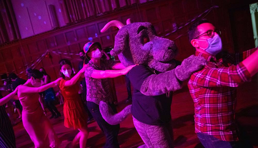 Graduate students celebrated in style, sharing an elbow bump with President Leshin in front of the 3D-printed Gompei statue created through a collaborative effort between the Makerspace and Prototyping Lab team in The Innovation Studio, assistant vice president and dean of students Greg Snoddy, and Adam Murrison ‘23.