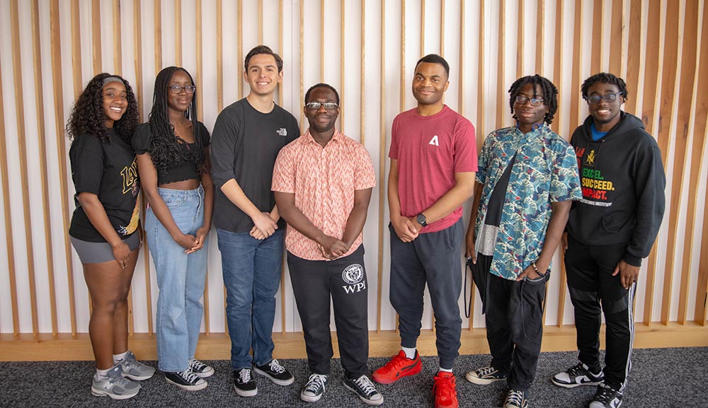 Seven of WPI’s LSAMP Scholars (L-R Ravyn Rapley, Abigail Boafo, Samuel Levitan, Samuel Appiah Kubi, Caleb Talley, Evans Owusu, and Dreivone Townsend) gathered for a group photo at the LSAMP End-of-Year Celebration before crossing the stage at Commencement this year.