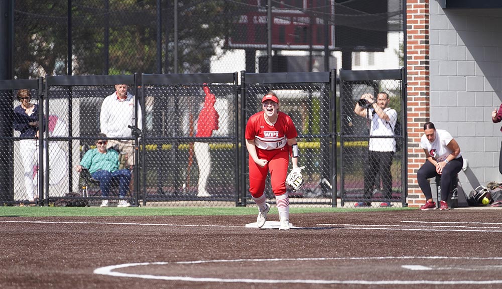 Emma Nagy ’26 celebrated from her position on first base as WPI Softball defeated first-ranked Springfield College during this year’s NEWMAC Softball Tournament.