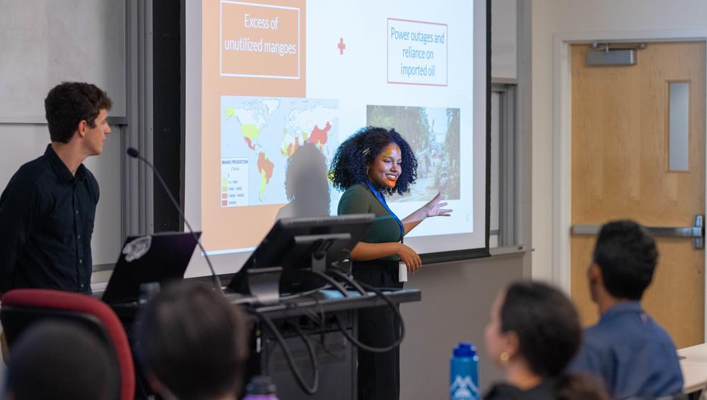 Robotics engineering majors Russell Hertel ’27 and Luis Alzamora ’26 presented QuickEst, an online tool that provides instant, accurate estimates for landscaping work. Landscaping companies can leverage the tool by loading cost points for different services into the system and embedding the tool on their website. When customers go to a landscaping company website that uses QuickEst, they could enter their address, use an online map to highlight where on their property they want work done, and choose from the list of services. The program would then calculate a quote for the customer, who could in turn request to schedule the landscaping work. The goal is to transform an outdated process of providing quotes in order to save time for contractors and clients.