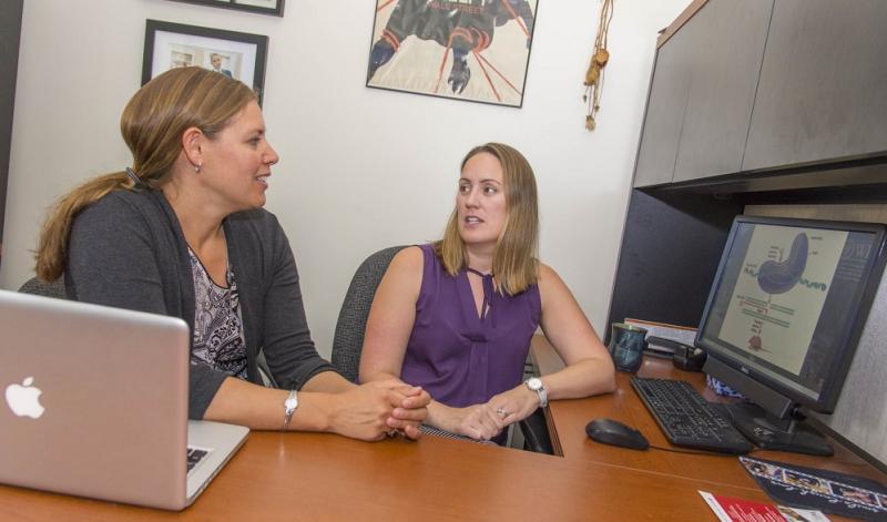 Natalie Farny, left, and Patricia Stapleton discuss a