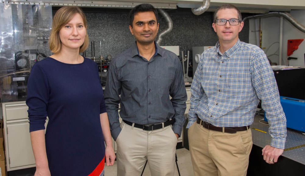 From left, Pratap Rao, PhD student Lite Zho (materials science and engineering), and Aaron Deskins examine a sample of a material being tested as a possible replacement for silicon in solar photovoltaic cells.