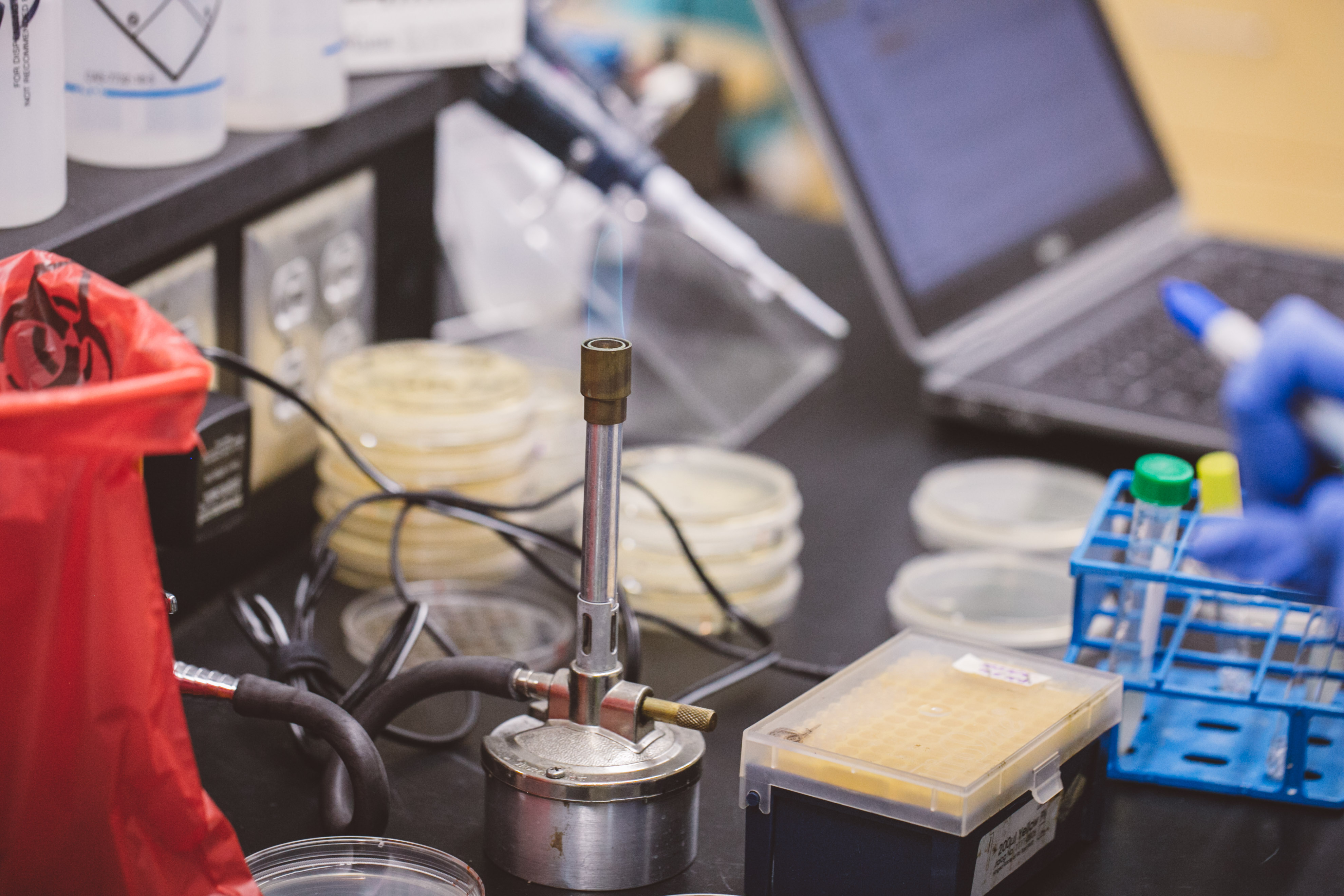 Flame sterilization is a standard microbiology technique. If possible, disposable sterile inoculating loops and cell spreaders should be substituted for flame sterilization to eliminate the need for open flame. If this technique must be used, researchers must ensure that the ethanol and other sources of combustion are not too close to the open flame, and that the open flame is positioned in a place which limits the passage of your hands near the fire. Researchers must adhere to the following steps when flame sterilizing on the open bench.