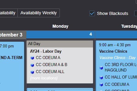 Availability view – This displays the most information at a quick glance. This is a single day view, but it will always include when the location is closed, blackout dates, and the additional setup/breakdown times on events. This view is especially helpful for comparing which locations are available at a specific time.