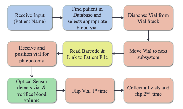 Incorporating technology into the phlebotomy process can also help reduce any human error present. The pre-analytical phase and the errors that occur here are a challenge that robotics and automation has not yet fully solved. There is a lack of robotic solutions that attempt to minimize pre-analytical errors in the ENTIRE phlebotomy procedure. Some marketed solutions solve individual problems in specific stages of phlebotomy. For example, those used for labeling, dispensing and scanning. There are currently various options in the market for vial labeling, including Ink, Laser or Label Printers. For dispensing there are different designs that have been developed for vial handling devices. Scanning options include camera or laser-based scanners. However, these solutions handle the individual errors in phlebotomy. Incorporating them into one device can be a simpler approach to help minimize the occurrence of errors. There is a market gap for solutions that use robotic technology to reduce many pre-analytical errors all at once not just individually.
