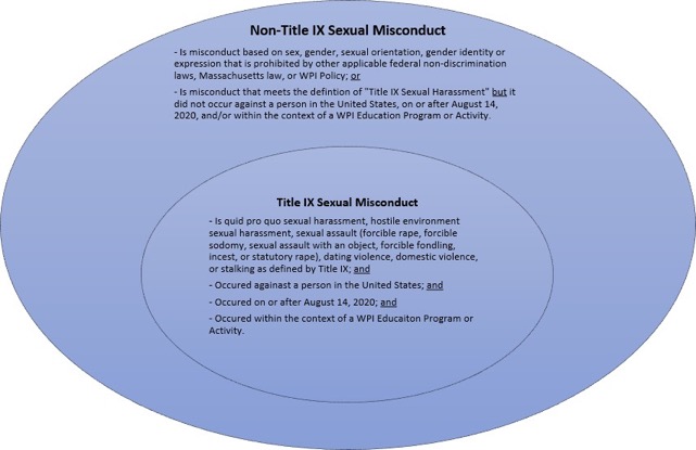 Prohibited Conduct The two links below will provide visual charts that will help explain what Prohibited Conduct is under the Interim Title IX & Sexual Misconduct Policy. Site Menu Menu Icon of three lines stacked on top of eachother Sidebar Menu Chev Down Icon of hollow arrow pointing down Arrow Left Icon of arrow pointing left How to Report Sexual Misconduct Chev Up Icon of hollow arrow pointing up Prohibited Conduct CONTACT Location: Rubin Campus Center Phone: 508-831-6514 titleix@wpi.edu Click here for a picture. Click here for a chart.
