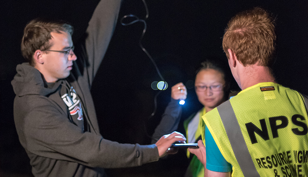 Measuring the sky glow at the top of Cadillac Mountain with teammates during an evening of fieldwork