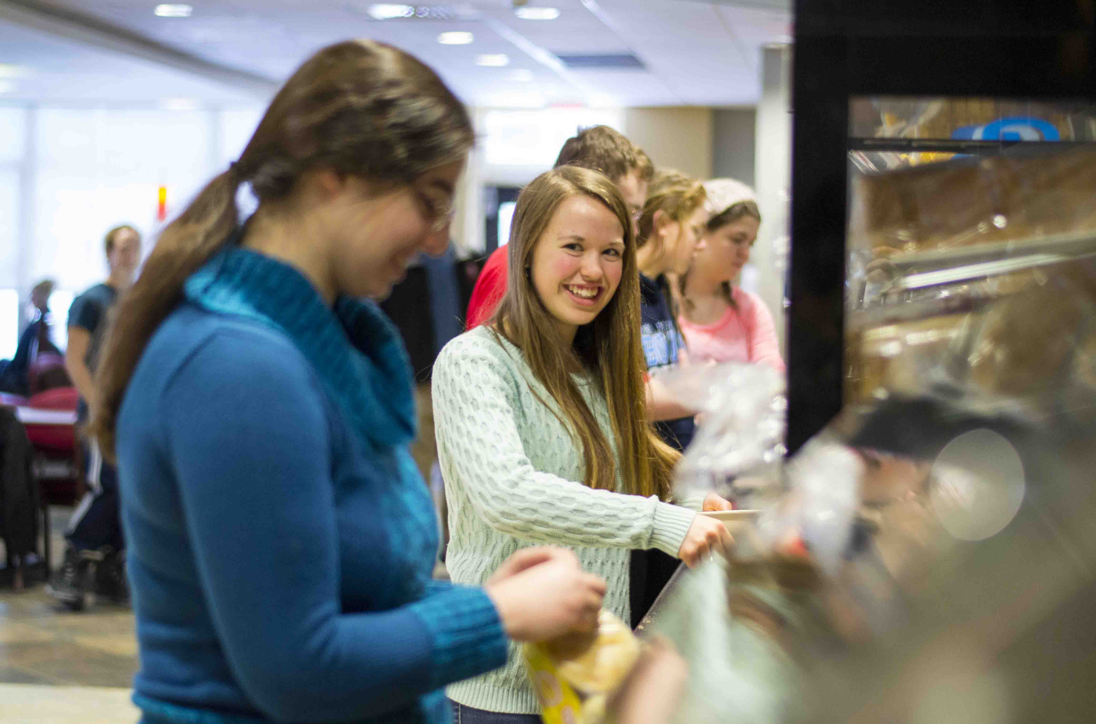 Cafeteria-style dining in Morgan Commons offers a buffet breakfast, lunch, and dinner with several entree choices, a salad bar, and grilled food (like hamburgers and chicken). In the Campus Center, you'll find an array of fast food choices in our food court, including pizza, stir fry, chicken wings, made-to-order sandwiches, soups, salads, and burgers. If you'd like a more sophisticated menu, you can have lunch in style at Higgins House. For a quick breakfast or afternoon pick-me-up, try Dunkin' Donuts in the Campus Center.